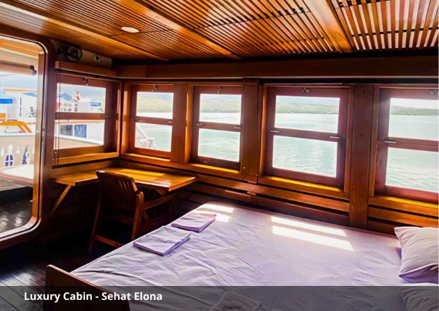Sehat Elona offers a variety of cabin types to accommodate different preferences and budgets. Luxury cabins located on the upper deck feature queen-size beds, private bathrooms, air conditioning, and private balconies where guests can enjoy sea views in privacy. Grand Deluxe cabins also provide queen-size beds and private bathrooms, offering a refined yet cozy space for rest.
